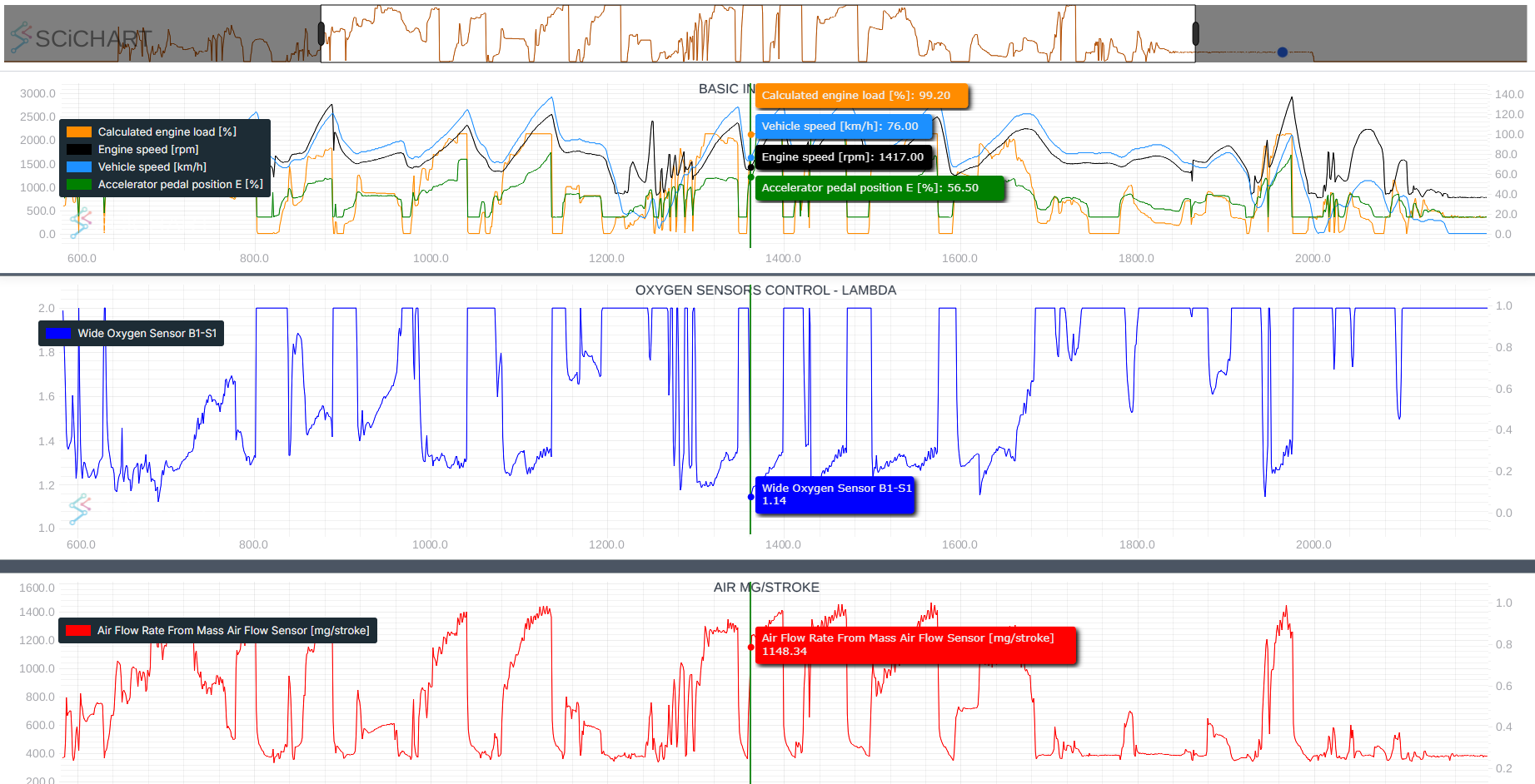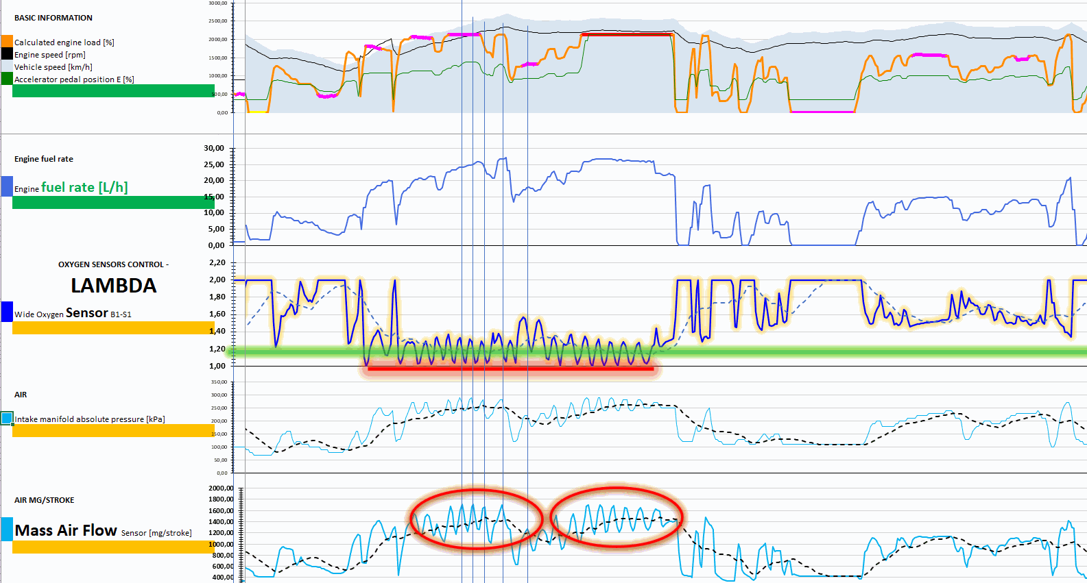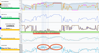 V logu jsou vidět opakované zátěže v podobných režimech, ve kterých systém regulace Wastegate kolísal a motor důsledkem toho, z nedostatku kyslíku, silně kouřil. Nyní je ze záznamu vidět, že motor ve všech situacích pracuje s komfortním přebytkem kyslíku, takže se saze netvoří.