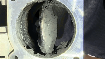 Tohle je škrtící klapka, která se nachází na vstupu čerstvého vzduchu do motoru do motoru, tedy ještě před EGR ventilem, takže by teoreticky neměla být vůbec zanesená karbonem. Proudí skrz ni totiž jenom čerstvý, se spalinami nemixovaný vzduch. Ale...! V sání však v nižších otáčkách vlivem otevírání a zavírání sacích ventilů panují pulzace, které cyklicky pohybují veškerým plynným médiem v sacím potrubí. Tím se dostávají spaliny, proudící z 10 cm vzdáleného EGR ventilu i do tělesa klapky. Klapka je znečištěna z jedné strany suchými sazemi, z druhé mastnými. Scházejí se tu dva problémy: Nadměrnou tvorbu sazí tady "obstarává" rozladěná regulace Wastegate "B" velkého turbodmychadla, mastnotu pak olej propouštějící turbodmychadlo s přispěním neodseparovných olejových par z odvětrání klikové skříně.